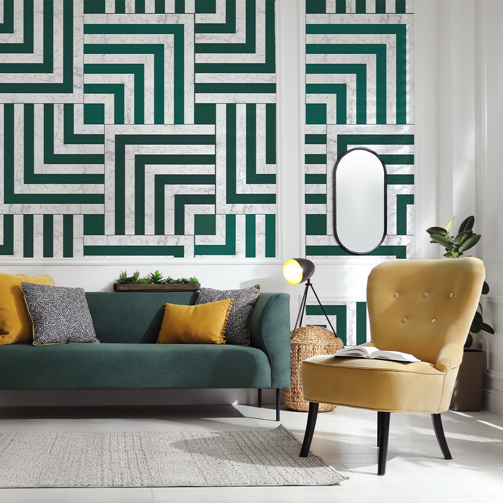 Kwadratowe płytki hipnotyzują swoją elegancją. Motyw Marble Tiles wykorzystuje strukturę marmuru, tworząc absolutnie niezwykły projekt. W wersji Ocean morski odcień zielonego gra pierwszoplanową rolę. Ten geometryczny wzór wpasuje się idealnie w aranżacje w stylu glamour, klasycznym czy Art Déco.